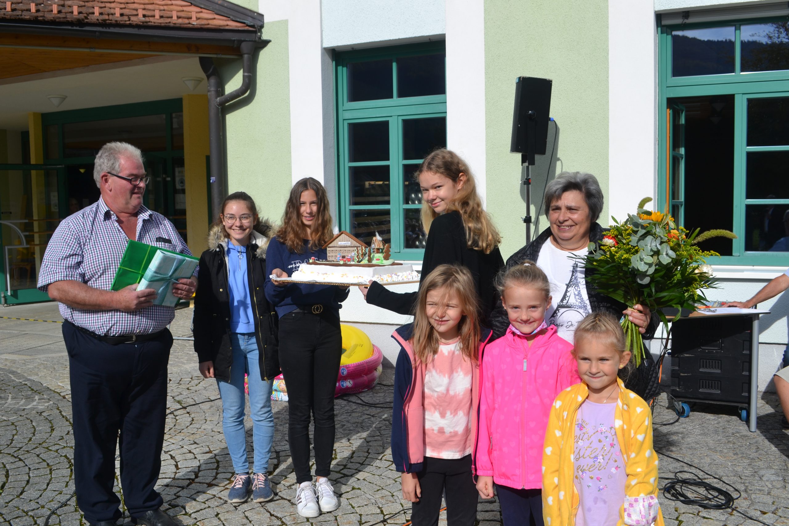 Das Wetter hätte es an diesem Tag nicht besser meinen können: ein strahlend schöner Herbsttag, mit frischer Luft und blauem Himmel ermöglichte es, das Abschiedsfest „corona konform“ im Freien abzuhalten. Mit Musik, Gesang und szenischen Darbietungen zeigte die Schüler*innen wie sehr sie die Beiden dankbar sind und sie vermissen werden. In seiner Ansprache wies OLMS SR Josef Födinger (in Vertretung von Dir. Christian Lamprecht) in launigen Worten darauf hin, wie sehr alle dem Schulwartehepaar dafür dankbar sind, dass sie die Gebäude derart gut „in Schuss“ gehalten haben, so dass sich alle Schüler und Lehrpersonen wirklich immer „wie Zuhause“ fühlten. Er wünschte „unserer Christl“ und „unserem Heli“ alles Gute für ihren neuen Lebensabschnitt. Die von Schüler- und Lehrerschaft überreichten Geschenke sollen ihnen den Abschied etwas leichter machen und vor allem versüßen.